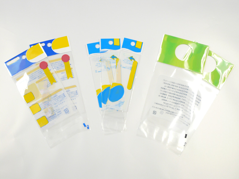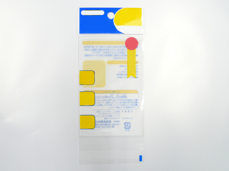 頭部分に合成紙を入れる事で強度を持たせ、吊り下げる事が可能な袋です。比較的軽いものに使用されています。 用途は雑貨や文房具など、ホームセンターやコンビニなどでよく使用されています。